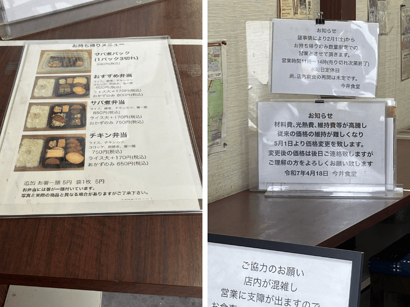 今井食堂のメニューと価格(2026年1月時点)